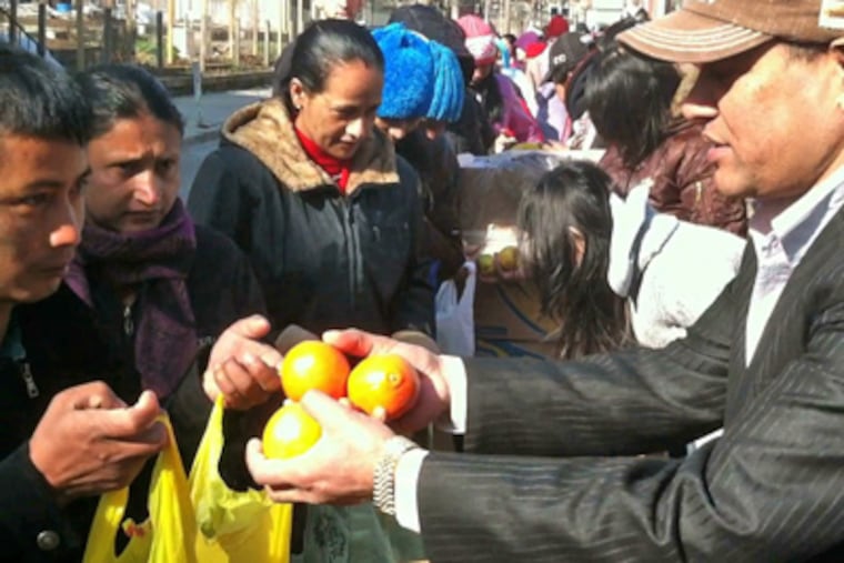 On Monday mornings in this neighborhood near Seventh and Emily Streets, the city's largest resettlement agency, Nationalities Service Center (NSC), gives away citrus and other fruit to a growing community of Nepalese, Bhutanese, and Burmese - the region's newest refugees.