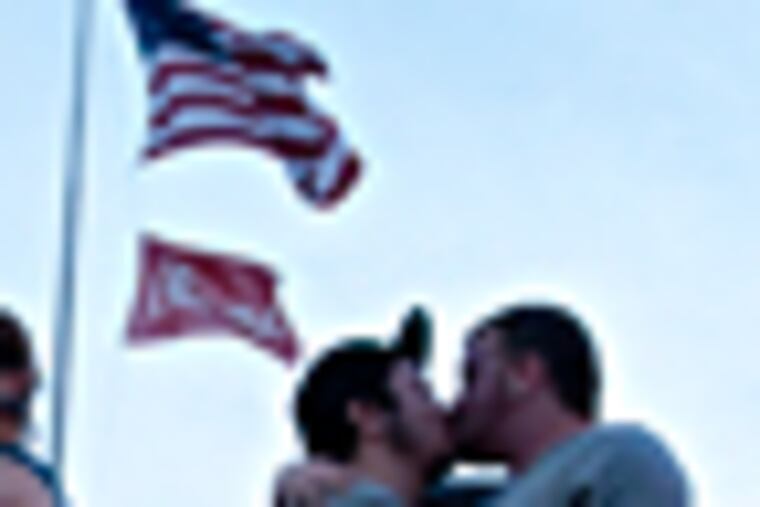 At the Chick-fil-A on Columbus Boulevard, same-sex couples and supporters of gay marriage traded smooches in front of TV cameras to the bemusement of some customers.
