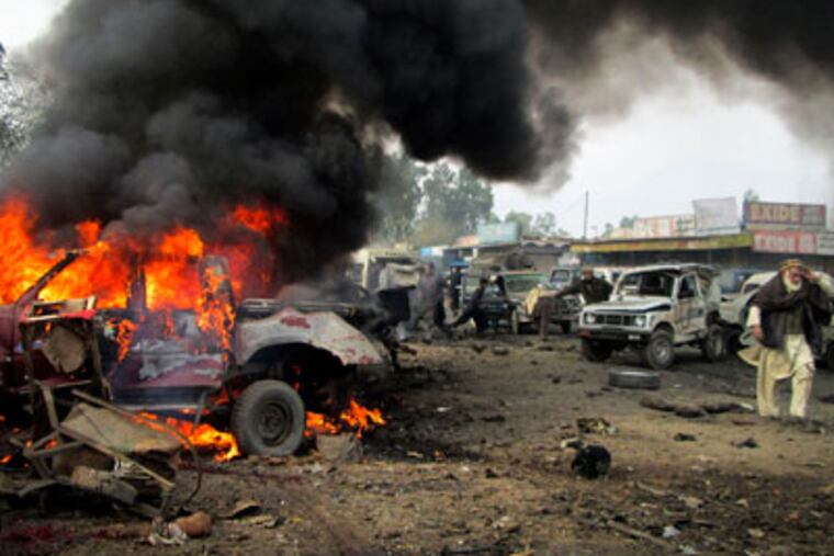 PESHAWAR, Pakistan - A car bomb exploded in a crowded market in Pakistan's troubled northwest tribal region near the Afghan border Monday, killing 17 people and wounding more than 40 others, officials said.