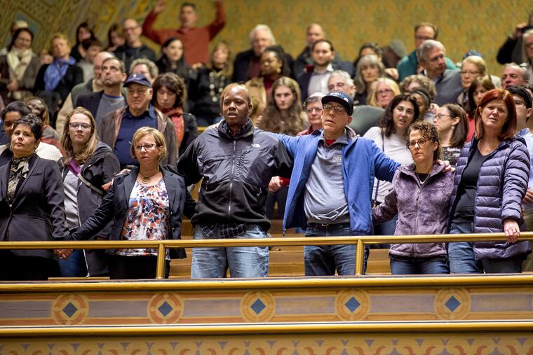 The throng started pouring into a Philadelphia temple well before the 5 p.m. start of Sunday's interfaith solidarity vigil for the Pittsburgh synagogue shooting victims, and it just kept coming — politicians and babies in strollers, ministers and rabbis, filling every seat and spilling into the lobby, united in their grief and the desire to stand up to hate.