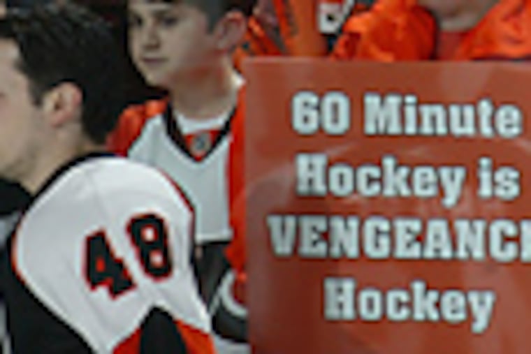 I say that because of the remarkable Flyers billboard I saw as I drove up I-95 on my way to Game 3 here in Philly. On it is a player whose eyes are black-and-blue. He has no stick in his hands. And how could he, considering his fingers are curled into fists like he's posing for a boxing poster?