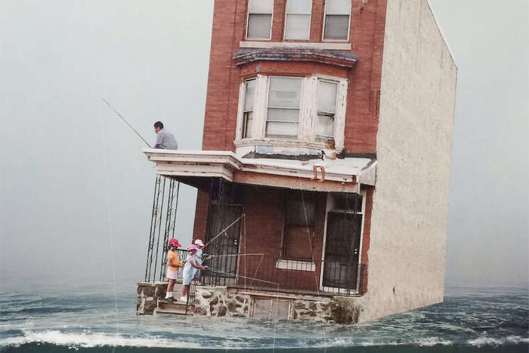 Gush Gallery is small, with a table in the middle selling T-shirts and, soon, jewelry and small crafts. The walls are currently devoted to the 12 artists whose work is on display this month. There is no one theme, style, or craft that unites the artwork, but almost all of the creators live in Philadelphia (with the exception of an expat who recently moved to Boston). The hangings range from what appear to be spider-web-tangled jewelry to tintype photography to a wonderfully photo-shopped image of a row house floating in the ocean, its inhabitants fishing from the windows.