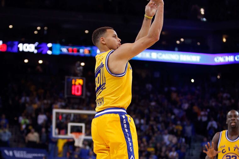 In that photo, Steph Curry is releasing a three-pointer from the deep corner. The Warriors star's form is geometric perfection. His feet, well off the ground, are close set and directly beneath him. His right arm is fully extended, the follow-through wrist pointing downward, toward the court. And the ball, high above, is arcing softly toward its defenseless target.