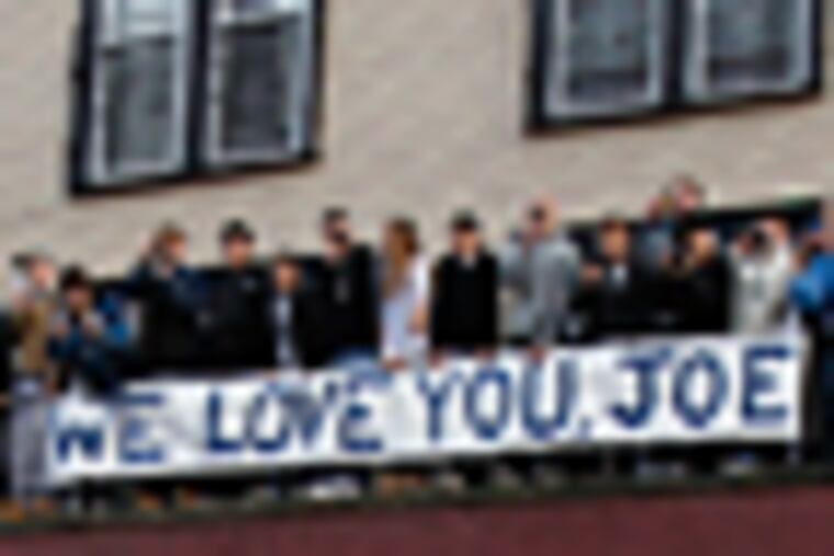 STATE COLLEGE, Pa. - Outside the Sleep Inn, a so-so hotel set behind a Snappy's gas station, the flags had been lowered to half-staff. On College Avenue, the workers at McLanahan's Student Store taped a simple paper symbol to the front window: a red Valentine's heart, broken in two.