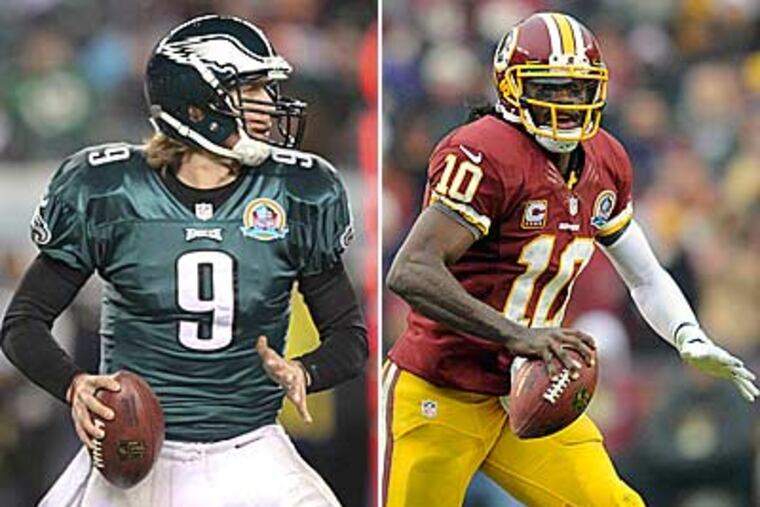 Griffin completed 14 of 15 passes for 200 yards and four touchdowns and finished with a perfect 158.3 rating in the first meeting. He was good, but the Eagles helped the rookie with a blown coverage and some shoddy defense. That was the old Birds pass defense, though. The unit has been rejuvenated since defensive line coach Jim Washburn's departure - unless it's pure coincidence. In the last two games, opposing quarterbacks have completed only 44 percent of their passes and they've been sacked eight times. Eagles defensive ends are lining up less in the wide-nine technique, which has allowed for more stunts and twists.