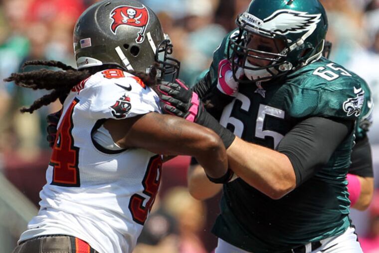 Lane Johnson, OT. "Has all of the physical tools you look for in a tackle. Fits Eagles scheme well. You knew coming out that there would be growing pains [in] Year 1. Will need to continue to get stronger to help him anchor. His improvement from his junior year to senior year in college shows that he's willing to work and wants to get better."