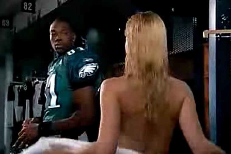 Did you know? According to Daily News Eagles beat writer Les Bowen, the scene needed some 40 takes and took 2 1/2 hours to shoot. Owens was not paid and Sheridan wasn't actually nude. The skit lives on on YouTube . . . "Desperate Housewives" ran until 2012; Sheridan's character was killed off in 2009. Owens' character (at least as an Eagle) was whacked in 2005 . . . Sheridan was 40 at the time the promo was filmed. She was born in England in 1963, the day before JFK was assassinated.