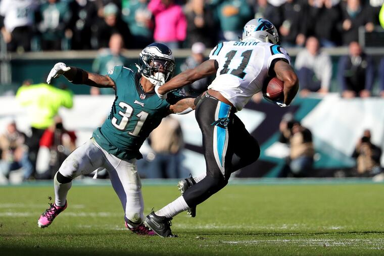 The Panthers regained possession with 2 minutes, 17 seconds remaining and a chance to take the lead. The defense forced three consecutive incompletions, setting up a fourth-and-10. The pass rush couldn't bring down Newton, who flicked a pass to former Eagles receiver Torrey Smith. Cornerback Jalen Mills had fallen and Smith ran 35 yards.