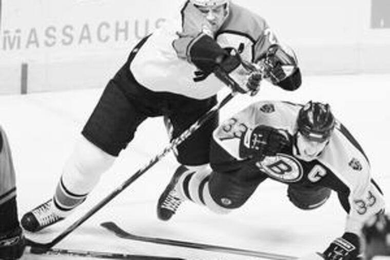 Mowers skated in alone and roofed it, giving Boston a 1-0 lead after 4 minutes, 10 seconds. Shortly after that, Mowers came in again and split the Flyers' defenseman, skating right between Denis Gauthier and Picard, making it 2-0.