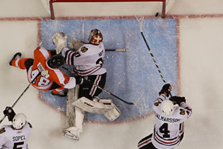And when Claude Giroux put the puck past Blackhawks goalie Antti Niemi 5:59 into overtime to give the Flyers a thrilling, 4-3 victory, this series started all over again.