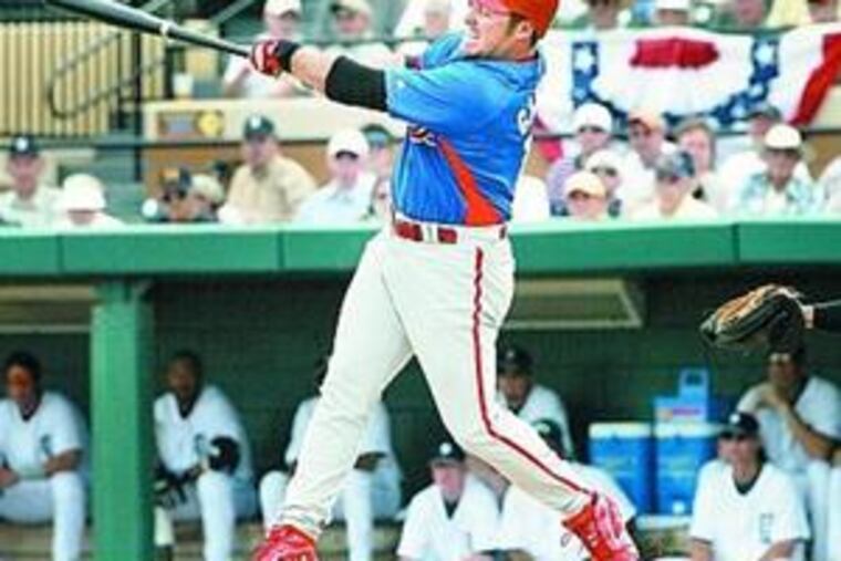 Dobbs has gotten the jump in catching the eyes of observers. He homered to right-centerfield in the sixth inning of the Phillies' exhibition win against Florida State Wednesday night, then went 3-for-4 yesterday in a 9-7 loss to Detroit. That included another homer and had his prospective teammates teasing him with movie references.