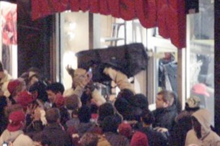Though the crowds were generally more joyous than rowdy, there was also unruly behavior, including some looting and cars being overturned.By midnight, crowds were ebbing in most sections of the city, except for south of City Hall, near Walnut and Broad Streets, where the celebration turned ugly. A car was set afire, and a luggage store was looted before police intervened. Firefighters turned a hose on some revelers, who were preventing them from reaching trash can blazes. Around 12:40, two buses full of police in riot gear arrived on the scene.