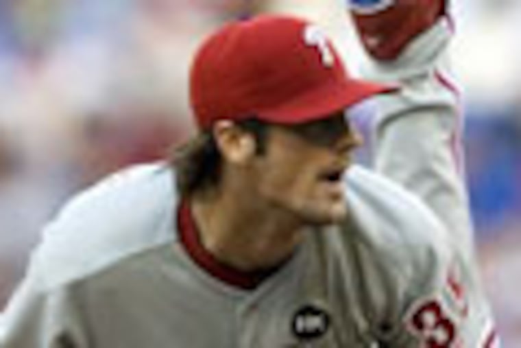 Kevin Millar stepped in and took two quick strikes, and Hamels delivered a curveball that home-plate umpire Mark Carlson ruled a ball. Hamels, appearing increasingly frustrated, motioned to Carlson in disagreement. Two pitches later, Millar lined a fastball to third; Pedro Feliz leaped to snag the ball, but it popped out of his glove.