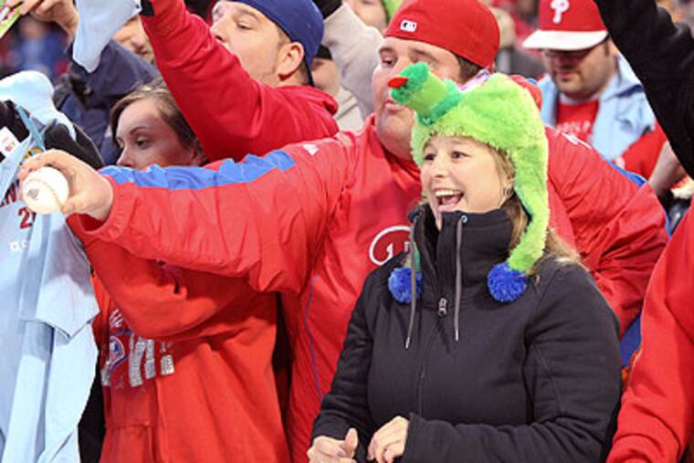 The Phanatic Dangle Hat -- a Sherpa-style earflap chapeau that lets fans wear the beloved mascot's head on their head -- has been a huge hit at Citizens Bank Park since it debuted at last week's season opener. The one-size-fits-most hat costs $24.99 at souvenir kiosks around the ballpark. We've seen it on everyone from kids to teens to beer-swilling tough guys -- our favorite look because their red faces were dramatically framed by Phanatic's protruding green plush snout and dangling thingies hanging over the fans' ears.