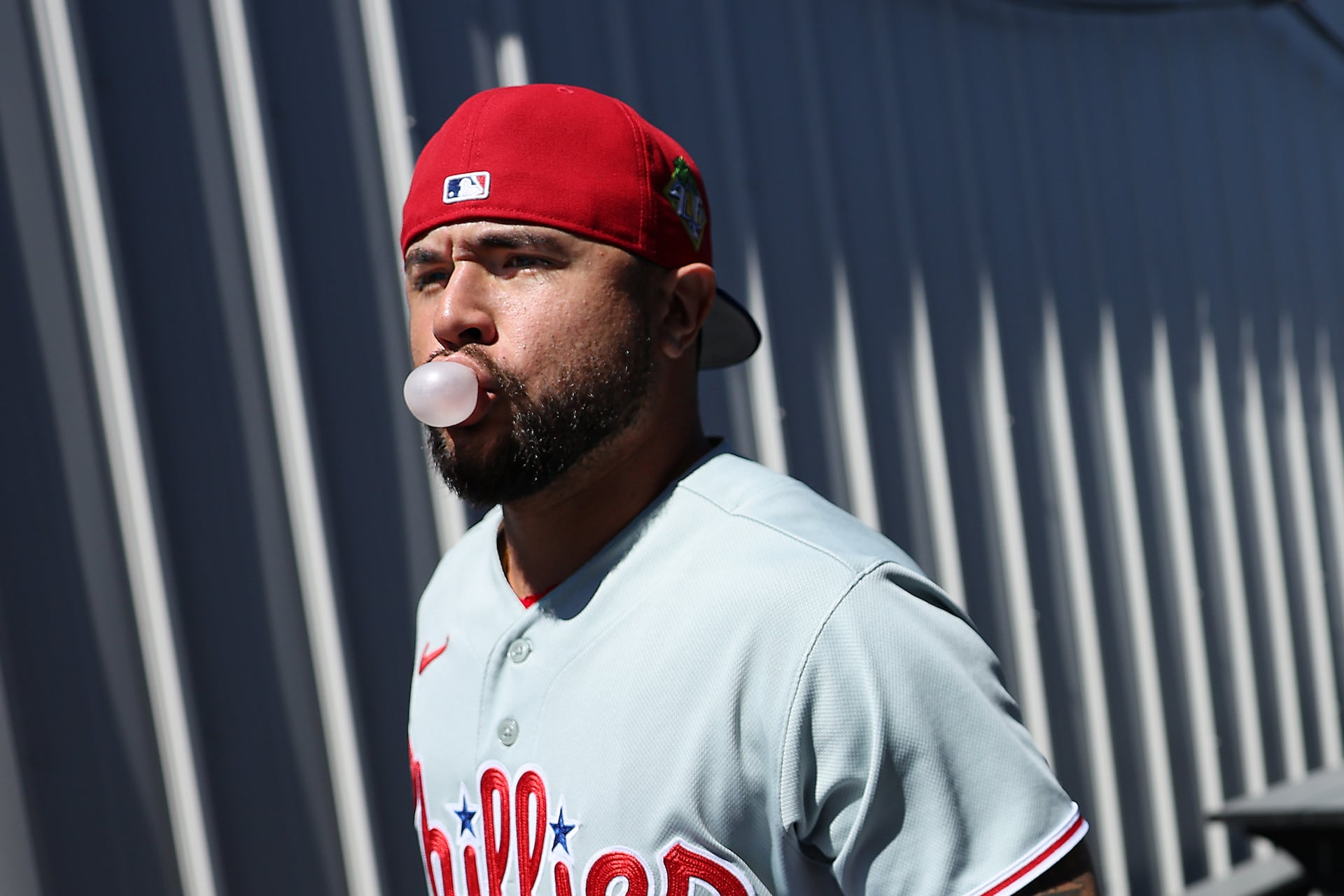 Covering Phillies spring training offers sports photographers an opportunity to stretch beyond everyday game coverage. On one of my first mornings at the training facility in Clearwater, Fla., I noticed pitcher Taijuan Walker stretching behind a palm tree. I knew it could make a picture, but it didn’t line up naturally. Every morning, he stretched. Every morning, I tried again. Finally, I made the picture on my last day in the Sunshine State. When I made the photo of bench coach Don Mattingly, I looked for a way to eliminate all other visual distractions. The morning light created a unique pattern on the tarp that put the attention on Mattingly. Using red as the dominant color holds the image of pitcher Kyle Backhus together. I again took advantage of the morning light to capture the shadow and fill the negative space. The portrait of manager Rob Thomson was a combination of a little planning and a lot of luck. I knew there would be a small window at sunrise when the sky would add some visual drama. Luckily, it was when Thomson was ready for his photo. The Phillies outfielders are seen through palm fronds during a game. The contrast of the mostly green palette with the red in the Phillies uniforms encourages the viewer to search into the image. For the photo of catcher Rafael Marchán jogging from the clubhouse, the pattern on the background caught my eye first. I then waited for someone to come into the space. The bubble gum gave the photo an extra pop.