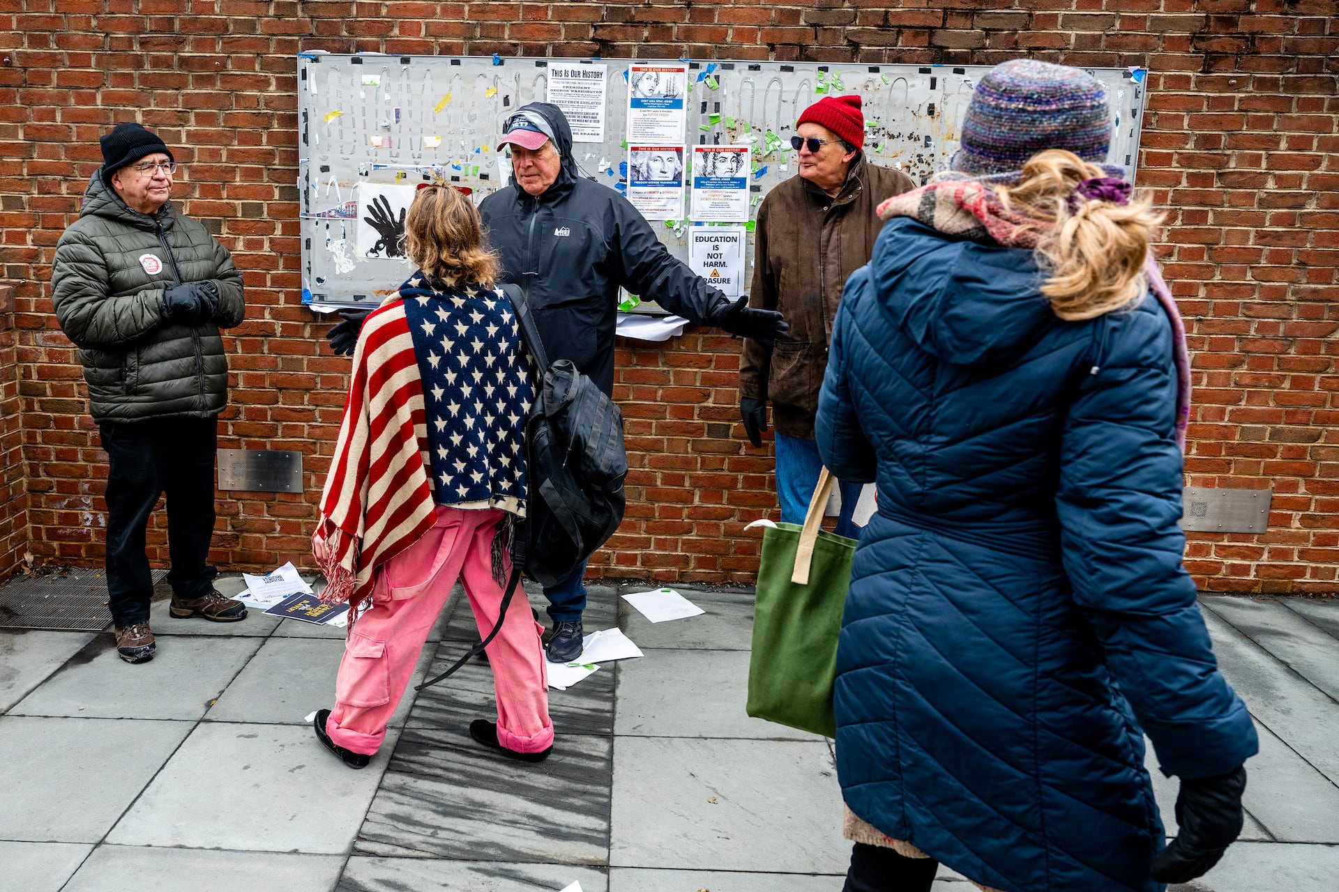 Glenn Bergman and his wife Dianne Manning were just arriving at the Avenging the Ancestors Coalition’s annual Presidents’ Day observance. They had earlier attended the weekly ICE vigil a few blocks away. Bystanders yelled at the woman to stop as she declared it was her “First Amendment right” while tearing off the notes.