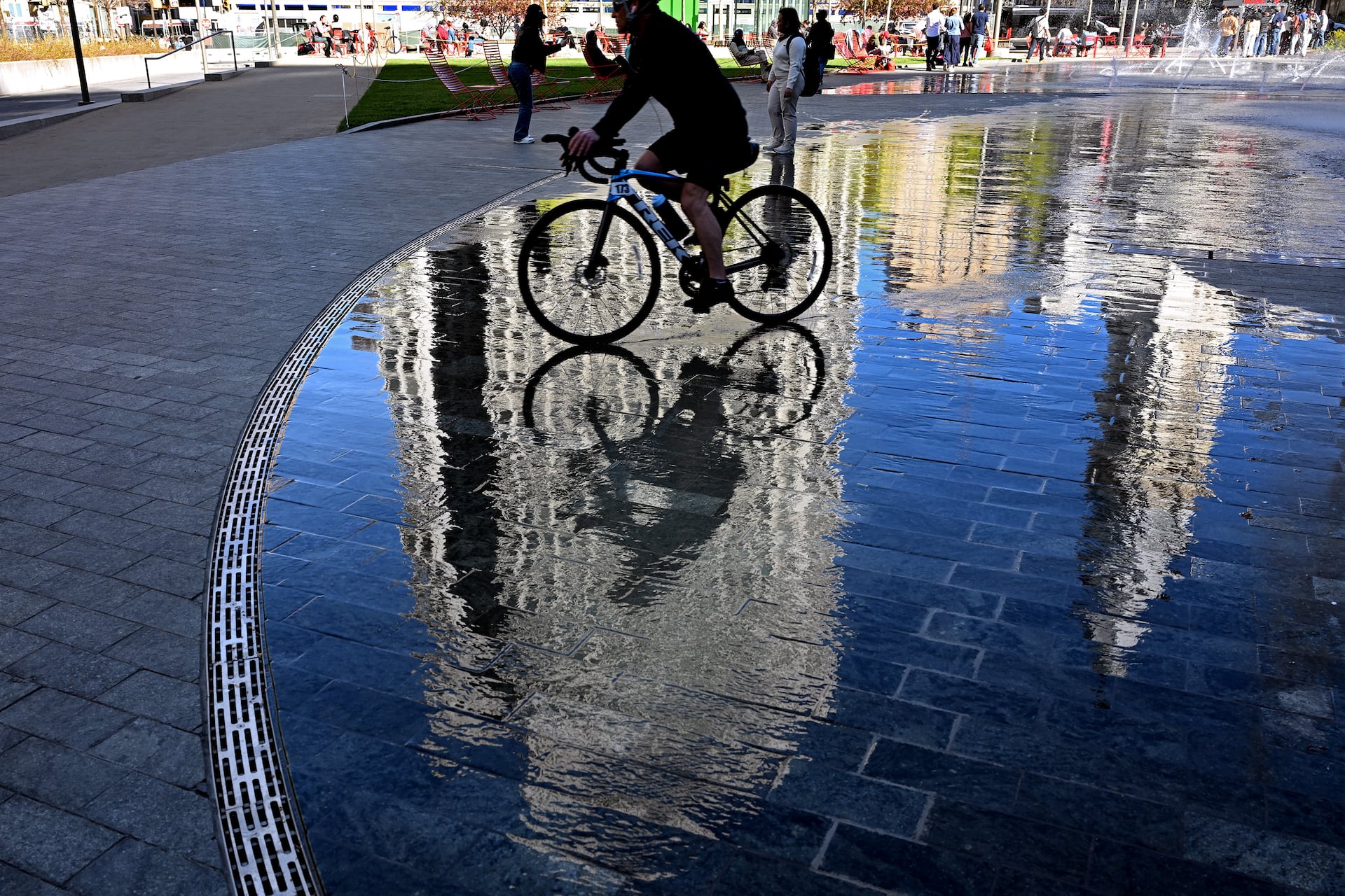 The splash fountain and basin-less main fountain in the park formally known as John F. Kennedy Plaza, was part of the site’s 2018 renovations. It came after the old park was flattened out, removing a traditional fountain and benches and levels that made it so enticing to skateboarders.