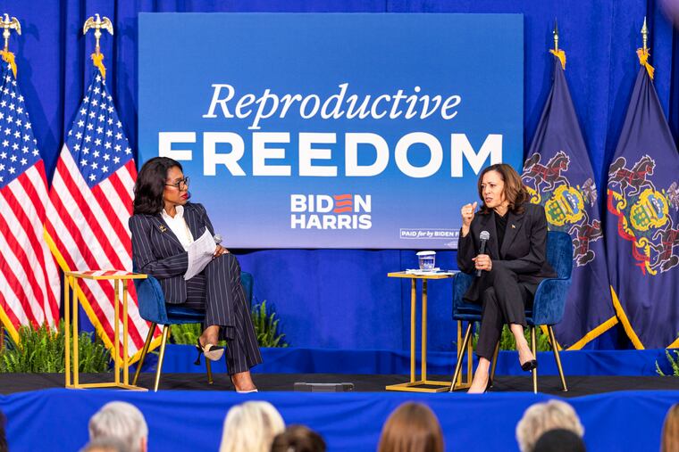 In a gymnasium at Salus University in Elkins Park, which specializes in health and science, the two women sat in front of a Biden-Harris campaign sign that said “Reproductive Freedom,” sandwiched between American and Pennsylvania flags.