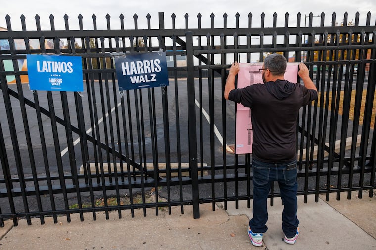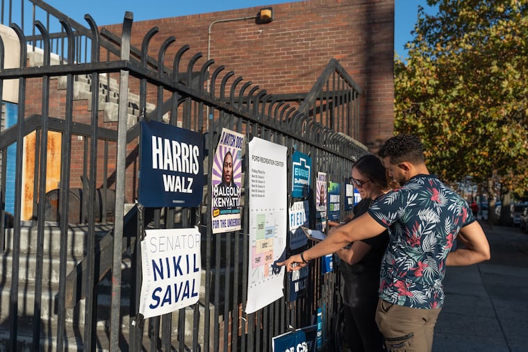 Signs for former President Donald Trump and vice presidential nominee JD Vance covered the sidewalk in the Republican-leaning precinct. Another swayed in the air as it hung from the window of a rowhome across the street.