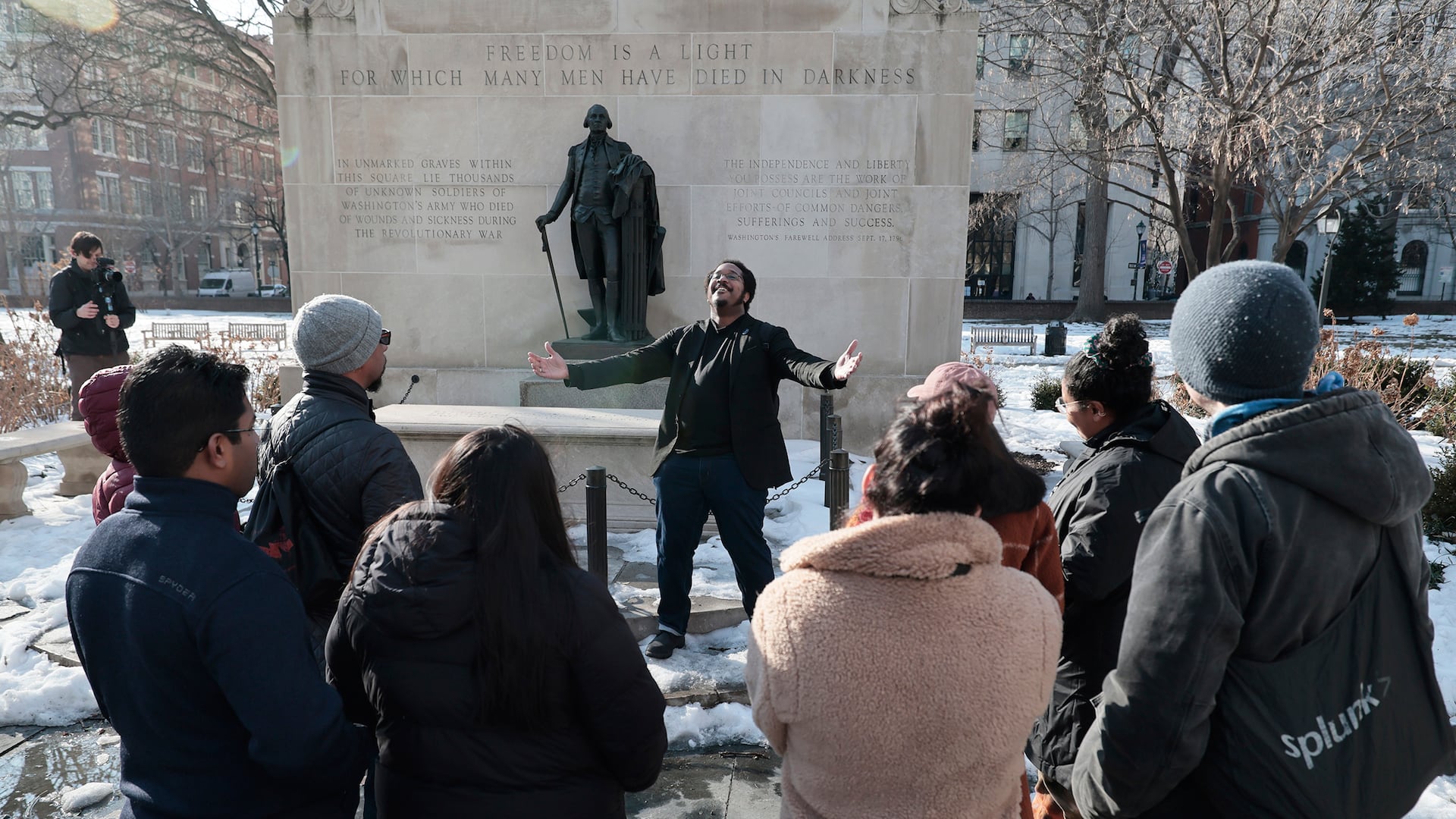Shortly before Johnson’s tour group stopped at the site, a volunteer read from a binder containing the informational text that had been removed. The volunteer was one of dozens of people who had signed up for a shift with Old City Remembers, a grassroots effort to speak the history of the President’s House even if the panels were no longer there.