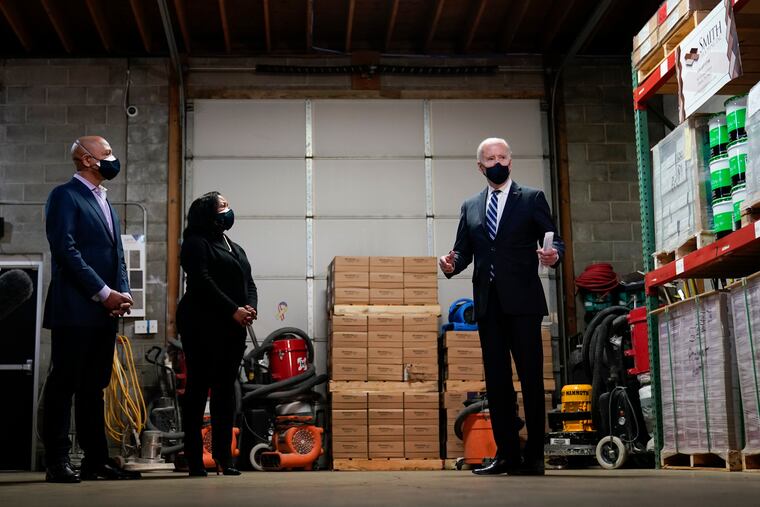 Biden launched his campaign to sell voters on the benefits of his sweeping economic relief plan from a Black-owned flooring company in Delaware County.