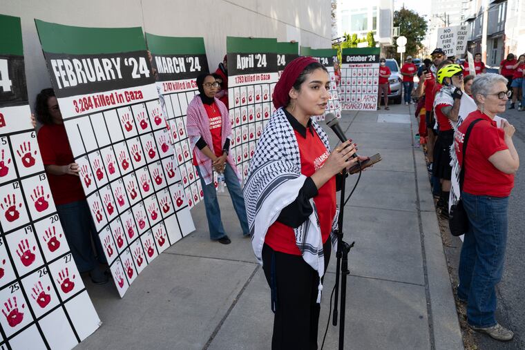 Leslie Kavasch, 32, a Philadelphia resident who works at a hospitality company and held a banner at the protest, said in an interview that she also sees ramifications of a Trump presidency for immigrants and LGBTQ people. She said that while she’s upset about Harris’ stances, she hopes activists can continue to advocate for an arms embargo under a Harris presidency instead of a Trump one.