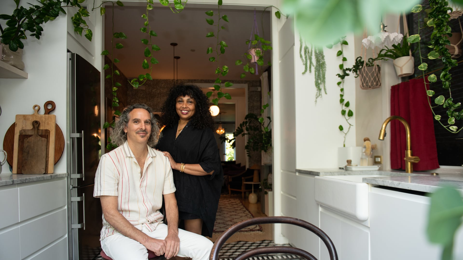 More leaves spill from planters hung from the kitchen ceiling. Jeremiah measured the depth of the Ikea cabinet drawers below the marble countertop to make sure they would accommodate spice-filled mason jars.
