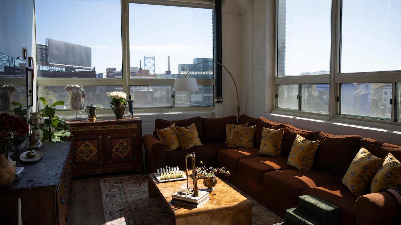 The 1,400-square-foot, two-bedroom corner unit has 14-foot ceilings with exposed ductwork and two walls of huge windows with views of Center City and the Ben Franklin Bridge. That’s important to Daubert, who finds that sunlight improves his mood.