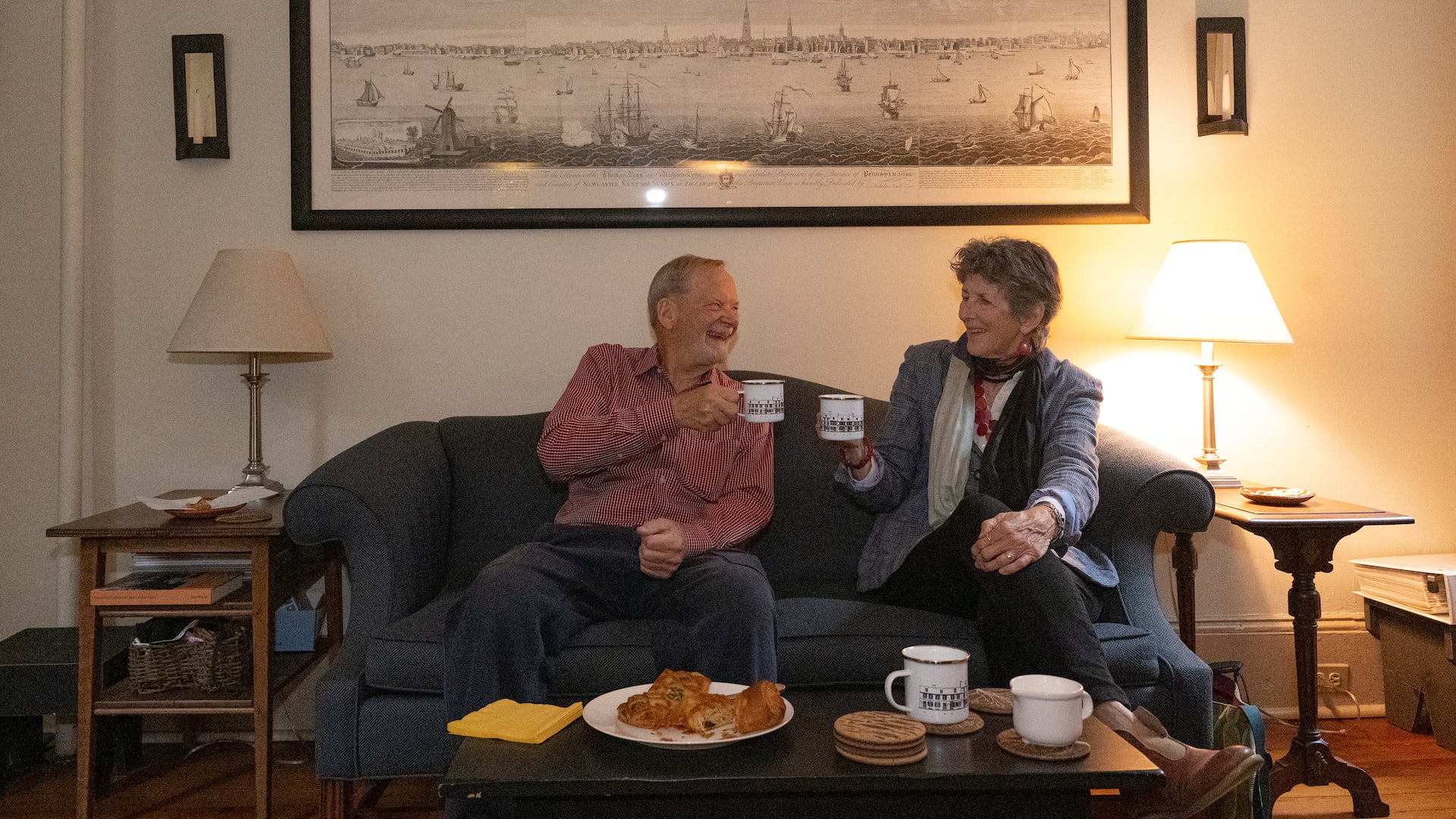 Sue, a retired Philadelphia schoolteacher, and Rob, a retired architect, are active in the Elfreth’s Alley Association. In the 1980s, the association lobbied with other civic groups to get barriers that would block the view of and noise from I-95. Rob designed the brick barrier wall at the end of the alley to blend in with the historic houses.