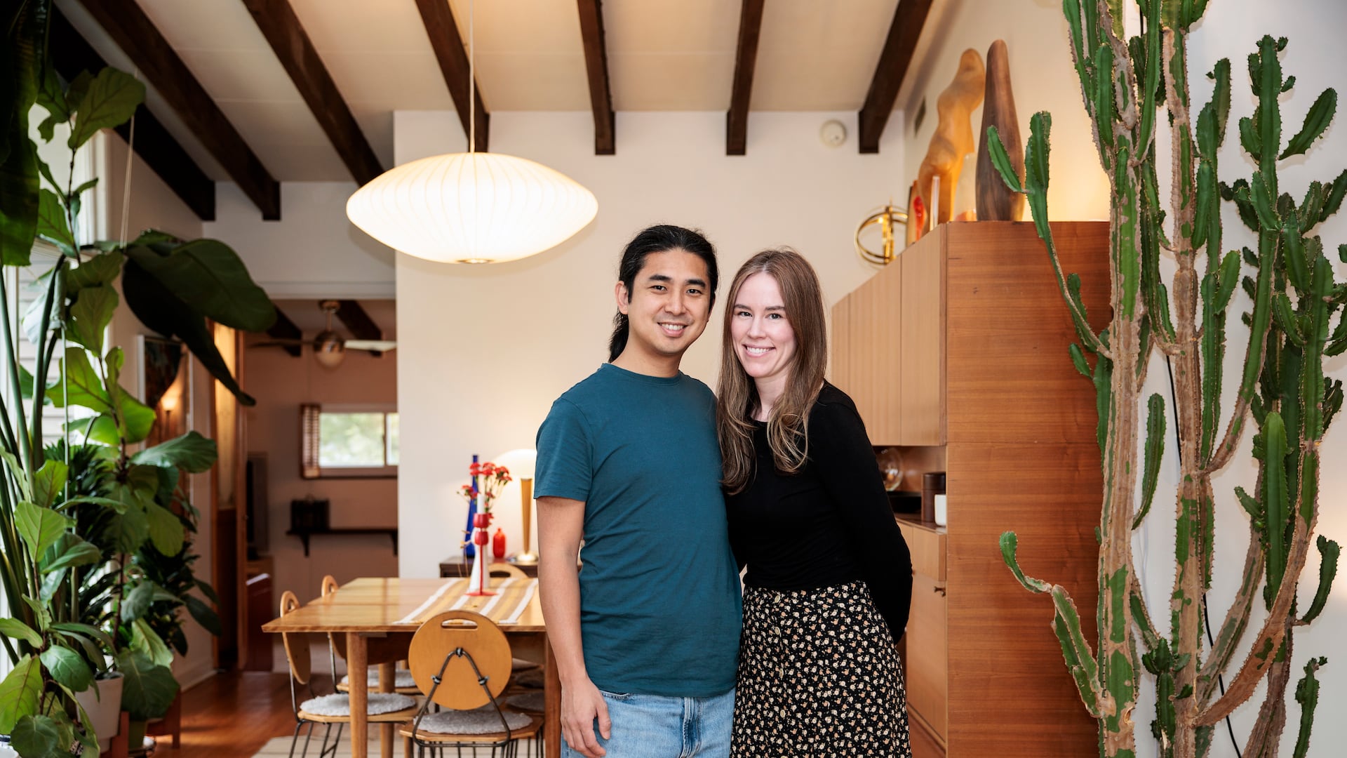 In the living room, they had to replace the expansive, floor-to-ceiling windows. They found the perfect midcentury-modern teak couch. The tear-shaped coffee table came from her grandfather. The dramatic lamp came from an estate sale down the street.
