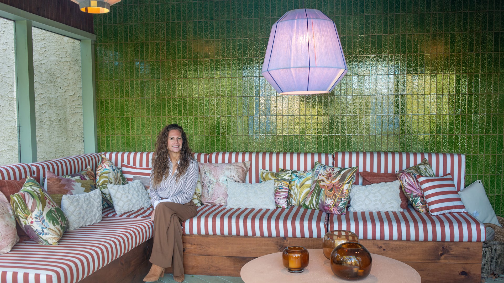 Outside, the decking was painted a moss green to blend with the surrounding foliage. The back wall of the covered porch was covered with glazed green tiles. The porch features a maroon-and-white-striped sectional and blue, beige, and purple lantern-shaped lights. “It’s a beautiful place to sit” and admire the pond and the changing colors of the leaves in late autumn, Casey said.