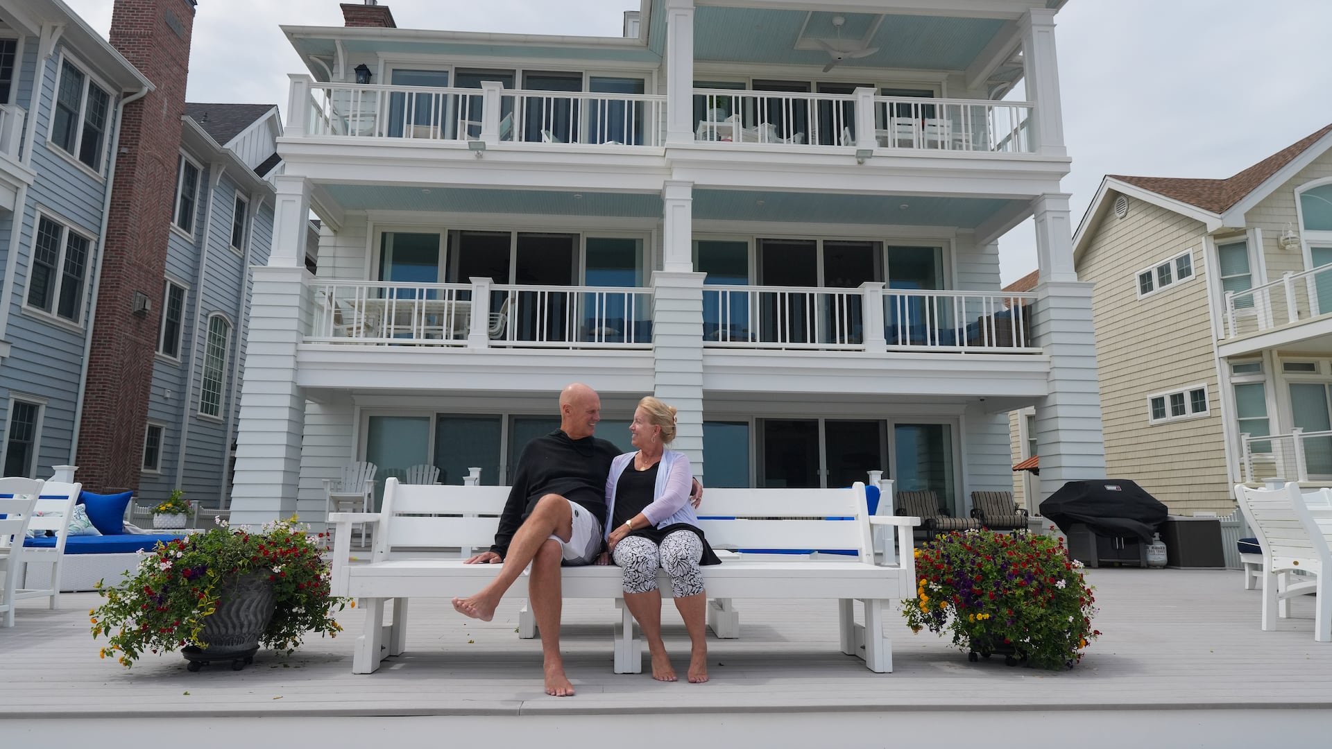 The home had been destroyed by Hurricane Sandy in 2012 and completely rebuilt by the previous owners in 2016. The Ormsbys occupy the bottom half of the duplex and share the back patio with their upstairs neighbors.