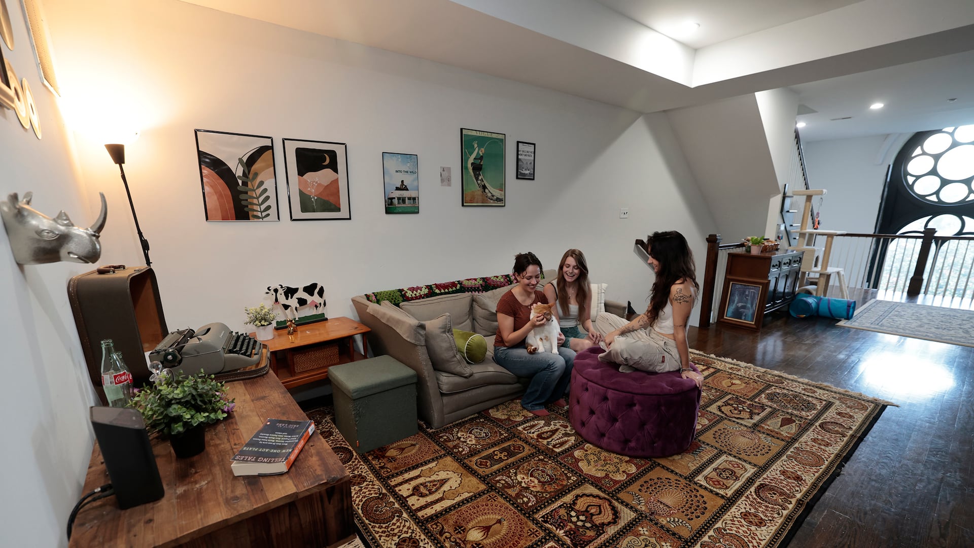 In that neighborhood, decades later, Corwynne Peterson, Riley Sperger, Ashlee Propst, and Magdalena Becker share a four-level unit in what was once Christ Reformed Church. The Romanesque-style brownstone place of worship was built in 1860 in the middle of a block of terraced houses.