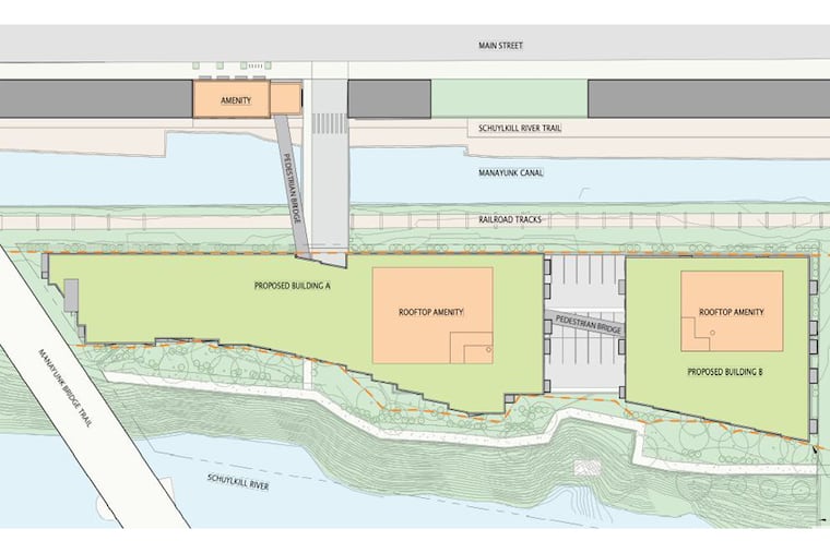 The project, by Rock Urban Development, would almost double the number of homes on Venice Island. It includes two four-story apartment dwellings connected by pedestrian bridges to a two-story amenity building on Main Street Manayunk that doubles as an emergency exit. The site borders the Manayunk Bridge Trail, immediately to the north.