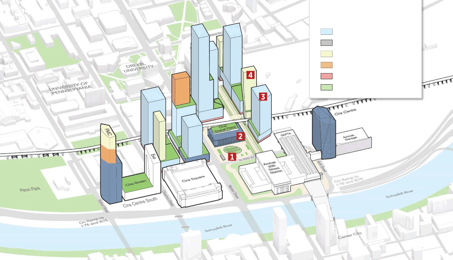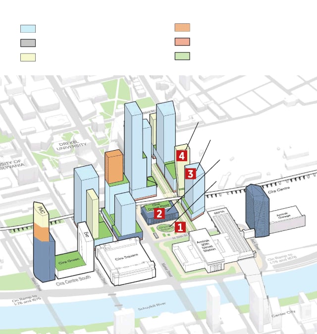 Two years after Brandywine Realty Trust first sketched out plans for its Schuylkill Yards innovation district, things are taking shape. One of its four projects was recently completed. 1) Drexel Square park opened June 10. 2) Kieran Timberlake has been hired to give the former Evening Bulletin Building a modern make-over. 3) Brandywine will break ground this winter on a 770,000-square foot office tower designed by PAU Studio. 4) It will also start work next door on a 344-unit apartment building with 200,000 square of office space.