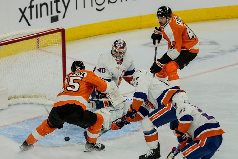 But two minutes after the Islanders’ second goal, the Flyers put together a long offensive possession. They kept the puck and created movement, passing it back-and-forth the offensive zone. Tony DeAngelo took a second to survey the ice from the blue line before taking a shot. Two minutes, 29 seconds after Barzal’s goal, Deslauriers deflected the puck in the net and cut the lead in half.