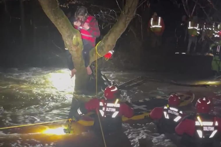 A dramatic video shows emergency crews from Delaware County rescuing a man from a tree stranded in an overflowing Marcus Hook Creek Tuesday night.